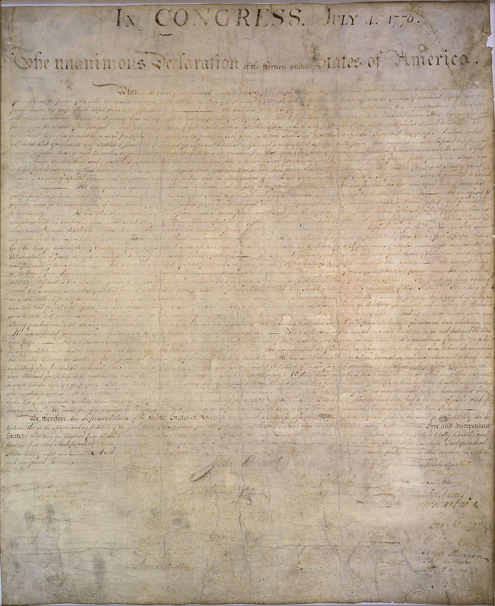 We hold these truths to be self-evident, that all men are created equal, that they are endowed by their Creator with certain unalienable Rights, that among these are Life, Liberty and the pursuit of Happiness.--That to secure these rights, Governments are instituted among Men, deriving their just powers from the consent of the governed, --That whenever any Form of Government becomes destructive of these ends, it is the Right of the People to alter or to abolish it, and to institute new Government, laying its foundation on such principles and organizing its powers in such form, as to them shall seem most likely to effect their Safety and Happiness. Prudence, indeed, will dictate that Governments long established should not be changed for light and transient causes; and accordingly all experience hath shewn, that mankind are more disposed to suffer, while evils are sufferable, than to right themselves by abolishing the forms to which they are accustomed. But when a long train of abuses and usurpations, pursuing invariably the same Object evinces a design to reduce them under absolute Despotism, it is their right, it is their duty, to throw off such Government, and to provide new Guards for their future security.--Such has been the patient sufferance of these Colonies; and such is now the necessity which constrains them to alter their former Systems of Government. The history of the present King of Great Britain is a history of repeated injuries and usurpations, all having in direct object the establishment of an absolute Tyranny over these States. To prove this, let Facts be submitted to a candid world.