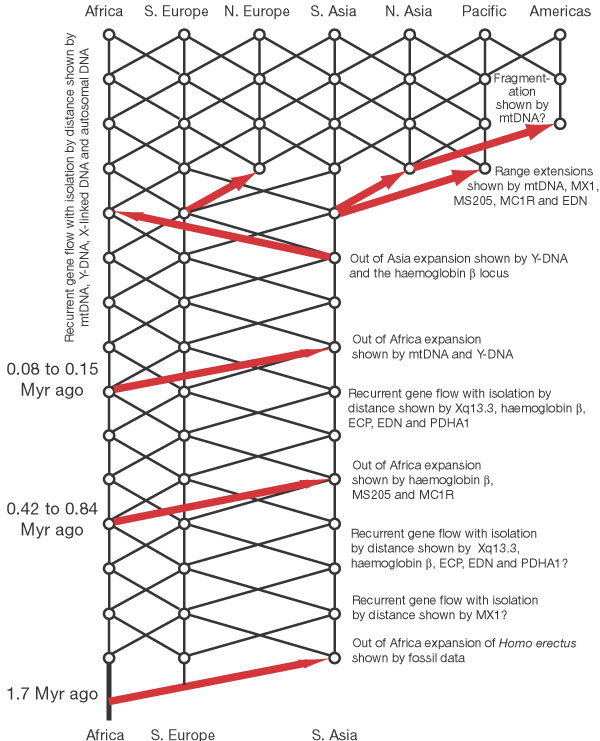 The model of recent human evolution shown in Fig. 1 is dominated by genetic interchange and a special role for Africa. I consider first genetic interchange. African and Eurasian populations were linked by recurrent gene flow, certainly over the last half a million years, and probably longer. Overlaid upon this gene-flow trellis are occasional major movements out of Africa and out of Asia that enhanced gene interchange through interbreeding. More recently, population expansions acted to extend the geographical range of the human species and to establish additional areas linked by gene flow. This model emphasizes that genetic interchange among human populations, facilitated both by gene flow and range expansions coupled with interbreeding, has been a major force in shaping the human species and its spatial pattern of genetic diversity.